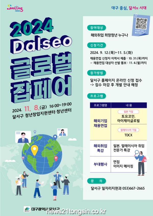 (뉴스21통신) 최우성기자 = 대구 달서구(구청장 이태훈)가 11월 8일 달서구 청년창업지원센터·청년센터에서 해외취업을 희망하는 청년들을 대상으로 「2024년 Dalseo 글로벌 잡페어」를 개최한다.