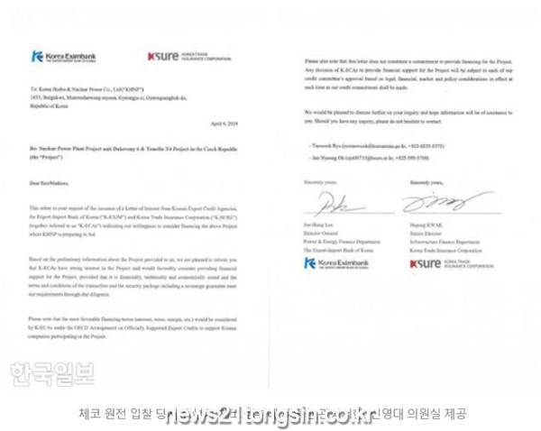 26일 국회 기획재정위원회 신영대 더불어민주당 의원이 입수한 서한을 보면 한국수출입은행(수은)과 한국무역보험공사(무보)는 공동 발급한 '관심 서한(Letter of Support)'에서 체코 정부 측에 "두코바니 6호기 및 테멜린 3·4호기 원전 건설 프로젝트를 한국이 수주한다면 '가장 최적의 금융조건 제공'을 고려한다"고 제안했다. 서한에서 두 기관은 "한국 수출 신용 기관인 한국수출입은행과 한국무역보험공사는 한국수력원자력이 입찰을 준비 중인 위 프로젝트에 대한 자금 지원을 고려할 의사가 있음을 나타낸다"며 "가장 유리한 금융 조건(금액, 기간, 마진 등)을 고려할 것"이라고 밝혔다. 해당 서한은 4월 신규 원전 입찰 마감 직전 한수원이 입찰 제안서를 내면서 함께 동봉돼 체코 측에 전달됐다.