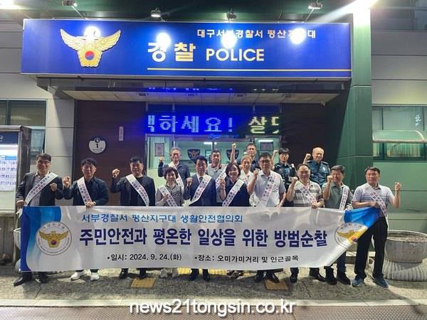 (뉴스21통신) 최우성기자 = 대구서부경찰서(서장 변인수) 평산지구대에서는 ’24.9.24(화) 18:30 서구에 위치한 서부시장 오미가미거리 및 달성공원 둘렛길 일대를 중심으로 ‘우리 동네 지키기’ 방범순찰을 진행했다.