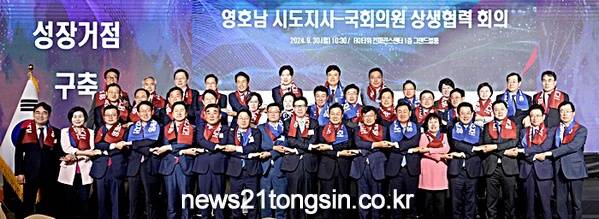 이후 영호남 8개 시도지사와 국회의원들은 수도권에 대응하는 남부권 성장거점 구축을 위한 공동결의문을 채택하며 협력을 다짐했다.