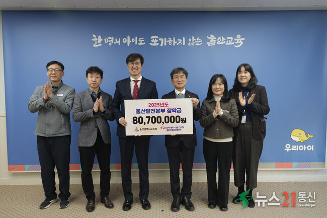 사진제공=울산광역시교육청울산광역시교육청(교육감 천창수)은 한국동서발전(주) 울산발전본부(본부장 안희원)에서 장학금 8,070만 원을 전달받았다. 장학금 전달식은 17일 오후 2시 접견실에서 천창수 교육감과 안희원 울산발전본부장을 비롯한 관계자들이 참석한 가운데 열렸다. 이번에 전달된 장학금은 발전소 인근에 거주하는 ...