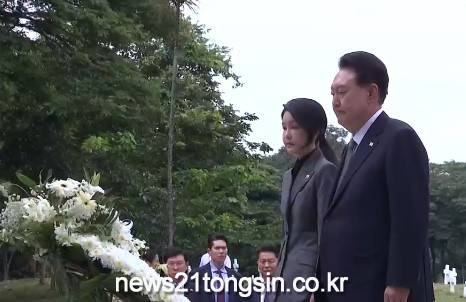 공항에 영접 나온 필리핀 정부 인사들과 인사를 나눈 윤석열 대통령은, 첫 일정으로 한국전 참전 용사 기념비를 찾았다.