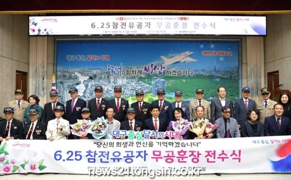 (뉴스21통신) 최우성기자 = 대구 달서구(구청장 이태훈)는 지난 4일 건군 76주년 국군의 날을 맞아 구청 대강당에서 6.25전쟁에 참전해 공을 세운 故 신정술 하사와 故 김태권 병장, 故 김대준 상병, 故 최준교 일병의 유가족에게 국방부 장관을 대신해 충무무공훈장과 화랑무공훈장을 전달하는 전수식을 개최했다.