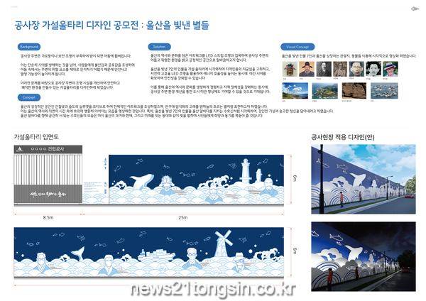 이번 공모전은 꿈의 도시 울산, 공사장 가설울타리 디자인을 주제로 울산 시내 곳곳에 설치된 공사장 가설울타리를 창의적이고 재미있는 디자인으로 채워 도시경관을 개선하고, ‘꿀잼 도시 울산’을 조성하기 위해 실시됐다.