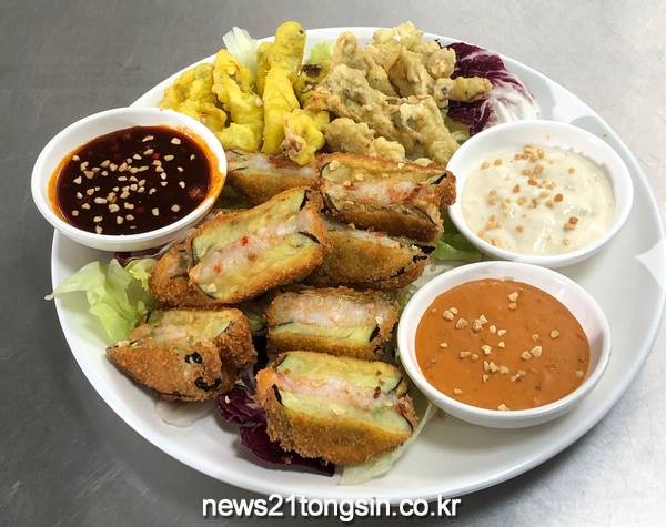 두 번째 메뉴인‘가지잡숴보새우 & 느타리버섯튀김’은 여주에서 재배된 가지와 느타리버섯으로 만든 간편한 핑거푸드다. 특히, 전국 느타리버섯 생산량의 60%를 차지하는 여주산 버섯이 사용되어 그 풍미가 남다르다. 바삭한 튀김과 새우의 쫄깃한 식감이 조화를 이루며, 축제에서 가볍게 즐길 수 있는 간편한 메뉴로 주목받고 있다.