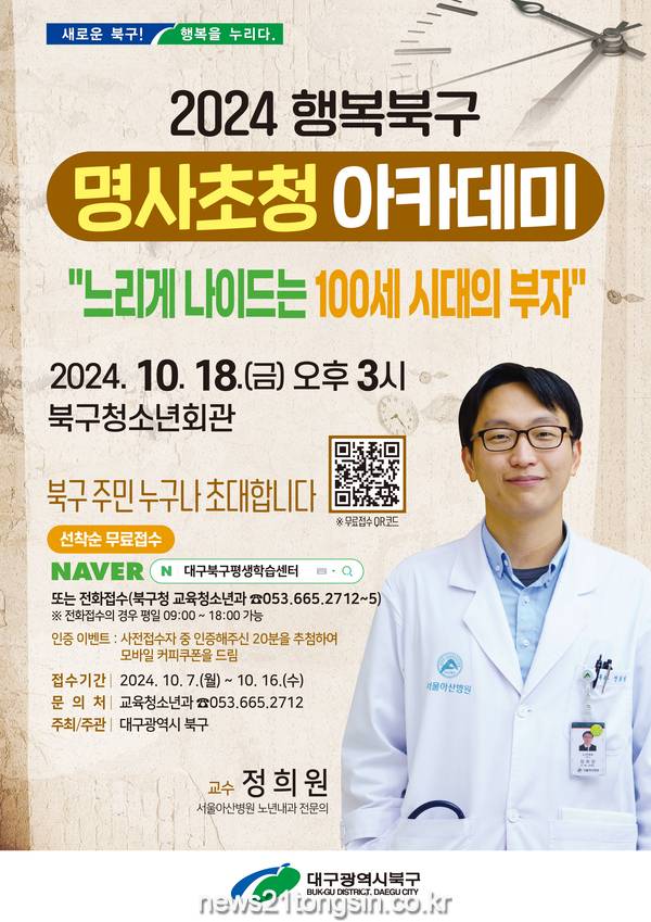 (뉴스21통신) 최우성기자 = 대구 북구청(청장 배광식)은 오는 10월 18일(금) 오후 3시, 북구청소년회관에서「2024 행복북구 명사초청 아카데미」10월 강연을 개최한다.