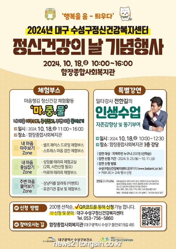 김대권 수성구청장은 “이번 행사가 주민들이 자신의 마음을 돌보는 시간이 되길 바란다. 정신건강에 관심 있는 누구나 많은 참여를 바란다.”고 전했다.