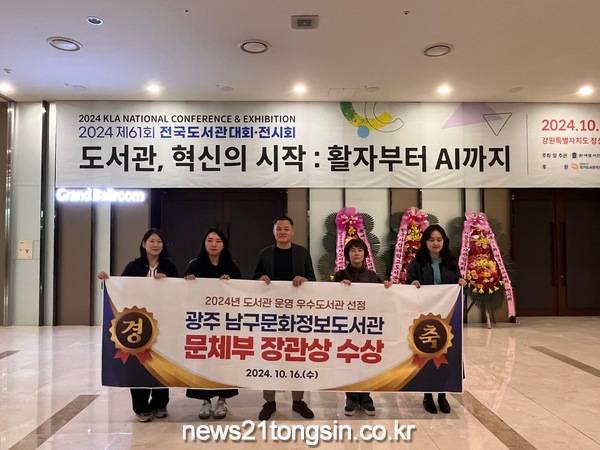 16일 남구(구청장 김병내)에 따르면 문화체육관광부는 이날 오후 강원랜드 하이원리조트에서 제61회 전국 도서관대회 개회식을 열고 도서관 운영 및 발전에 이바지한 남구 문화정보도서관을 우수도서관으로 선정한 뒤 장관상을 수여했다.