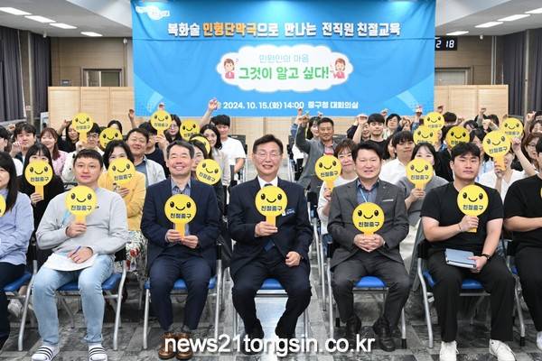 또한, 교육에 앞서 친절한 중구 조성을 위한 ‘친절결의문’ 낭독 후 참석 직원 모두 ‘친절 중구’ 손팻말과 손가락 인형을 들고 열린 마음으로 주민과 소통하며 더 나은 민원서비스 제공을 위해 실천 다짐 대회를 개최하였다.