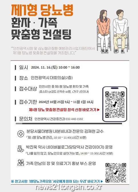 인천시 전체 인구 대비 당뇨병 환자 비율은 7.98%로 특·광역시 중 부산시(8.08%)에 이어 2위이며, 전국 평균인 7.69%보다도 높은 것으로 나타났다.제1형 당뇨병은 췌장에서 인슐린이 전혀 분비되지 않아 발생하는 질병으로, 인슐린 분비 기능은 일부 남아있지만 잘못된 식습관, 운동 부족, 스트레스 등 여러 가지 원인으로 인슐린 저항성이 증가하여 발생하는 제2형 당뇨병과는 차이가 있다.성인은 대부분 제2형 당뇨병 환자가 많은 반면, 19세 미만 소아‧청소년은 제1형 당뇨병 환자가 전체의 90%를 차지한다.이른 발병에 비해 현재까지 완치할 수 있는 치료법이 없는 실정으로, 증상을 완화하고 합병증의 발생을 최소화하는 것이 무엇보다 중요하다.이에 인천시는 이번 맞춤형 컨설팅을 통해 제1형 당뇨병 환자와 가족들에게 종합적인 지원을 제공할 계획이다.분당서울대학교병원 소아청소년과 김재현 교수를 초청해 관리 방법, 주의점, 질의응답 등 전문 컨설팅을 진행한다.이어 제1형 당뇨병 환자이자 약대를 졸업하고 열심히 살아가고 있는 박상욱 강사를 초대해 ‘나를 잃지 않고 당뇨인으로 살아가는 방법’이라는 주제로 환자와 가족들에게 힘을 실어 주는 강의를 준비 중이다.또한 행사장에는 제1형 당뇨병 환자가 사용하는 연속 혈당 측정기, 인슐린 자동주입기 제조, 수입, 판매사 10개 사를 초대해 홍보 부스를 운영한다. 이를 통해 환자들이 필요한 의료기기에 대한 비교 및 사용 방법에 대한 정보를 습득할 수 있도록 할 예정이다.제1형 당뇨병 환자·가족 맞춤형 컨설팅 접수는 10월 25일 오전 9시부터 11월 1일 오후 6시까지 진행되며, 인천시 누리집에 게시된 포스터의 큐알(QR) 코드를 인식해 신청할 수 있다.컨설팅은 시간 관계상 선착순 60명에 한정해 진행되는 만큼 참여를 원하는 환자와 가족들은 기간 내 서둘러 신청할 것을 당부했다.김학범 시 보건복지국장은 “이번 맞춤형 컨설팅이 제1형 당뇨병 환자 의료기기 지원사업과 더불어 제1형 환자들의 어려움을 해소할 수 있는 계기가 되기를 바란다”며 “시민들의 꾸준한 건강관리를 위해 군·구 보건소와 협력하여 노력하겠다”라고 말했다.