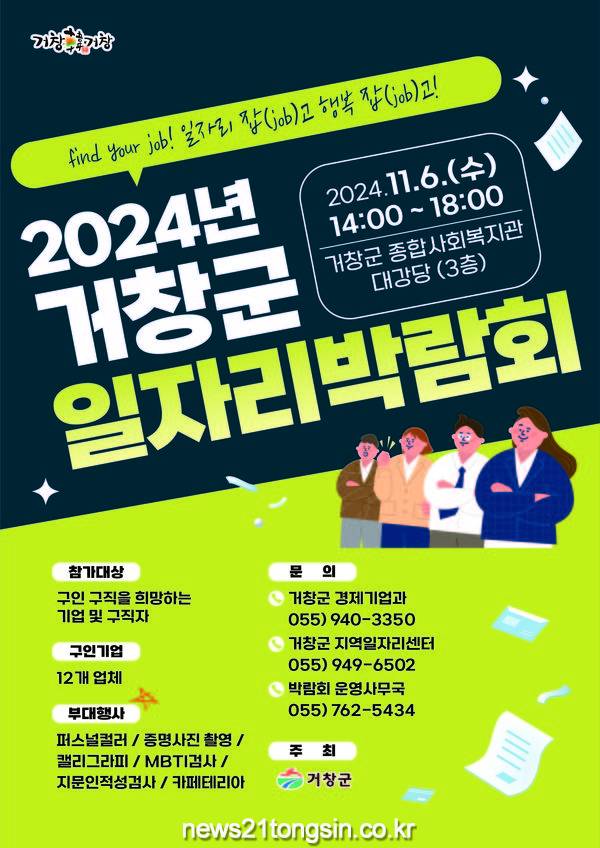 거창군은 오는 11월 6일 오후 2시 거창군 종합사회복지관 3층 대강당에서 ‘일자리 잡(Job)고! 행복 잡(Job)고!’라는 슬로건으로 2024년 거창군 일자리 박람회를 개최한다고 16일 밝혔다.