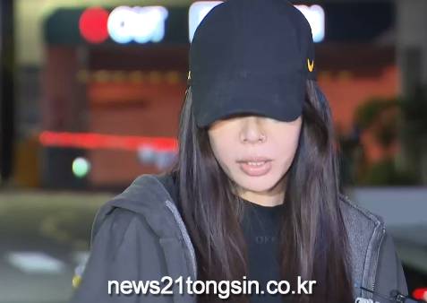 늦은 밤, 검은색 모자를 눌러쓴 가수 제시가 경찰에 출석한다.