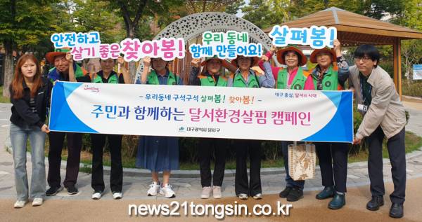 특히 올해는 「주민과 함께하는 달서환경살핌 캠페인」도 병행 실시해 주민 인식 개선 및 안전한 생활환경 조성을 위해 노력하고 있다. 달서구는 2020년부터 주민들이 안전 위험 요인 및 불편 사항에 대해서 제보할 수 있도록 「달서환경살핌방」SNS 밴드를 운영하는 등 주민참여형 환경순찰을 지속적으로 발굴·추진하고 있다.