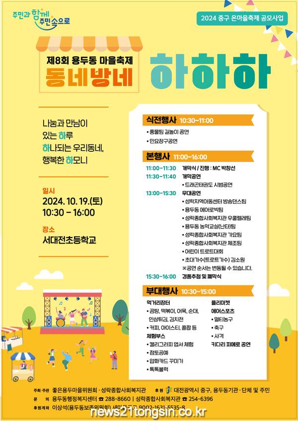 이번 축제는 좋은 용두마을위원회(위원장 이상석)와 성락종합사회복지관(관장 이경화)등 지역주민이 함께 힘을 모아 준비했으며, 문화예술공연, 먹거리장터, 플리마켓, 체험부스 등 다양한 볼거리와 즐길거리를 제공할 예정이다.특히 태권도 학원 시범공연, 지역아동센터 방송댄스 공연, 주민자치프로그램과 사회복지관 프로그램 발표회 등 우리 동네 주민이 꾸미는 문화예술 공연을 비롯해 초대 가수 공연, 주민 노래자랑 등 다채로운 무대가 펼쳐진다. 이외에도 자생단체 회원들이 손수 준비한 먹거리, 에어 스포츠와 전통놀이 등 각종 체험 프로그램도 마련된다.이상석 위원장은 “올해로 8회를 맞이하는 이번 축제는 나눔과 만남이 있는 하루, 하나되는 우리동네, 행복한 하모니라는 행사의 취지에 맞게 알차게 준비했다.”라며, “주민들의 많은 참여와 관심 부탁드린다.”라고 말했다.최순덕 동장은 “주민과 함께 체험하고 즐길 수 있는 만남과 소통의 자리이자 동네잔치인 만큼 가족, 이웃과 함께 방문하시어 즐거운 추억을 많이 쌓으시길 바란다.”라고 전했다.