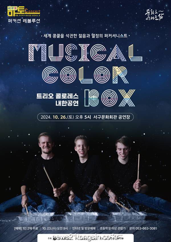 (뉴스21통신) 최우성기자 = 서구문화회관은 오는 26일 5시 서구문화회관 공연장에서 10월 서구愛 마토콘서트 시리즈로 유럽과 미국에서 타악기로 국제 콩쿠르를 석권한 트리오 콜로레스를 초청하여‘뮤지컬 컬러 박스’리사이틀을 개최한다고 밝혔다.