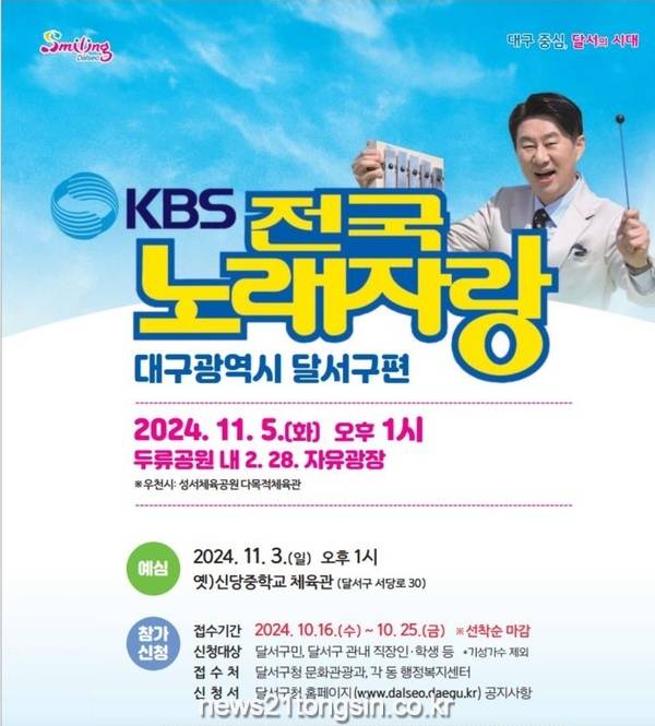 (뉴스21통신) 최우성기자 = 대구 달서구에서는 25일까지 노래와 댄스, 재치있는 입담을 갖춘 끼와 열정이 넘치는 구민들을 대상으로 'KBS 전국노래자랑' 참가 신청자를 모집한다.