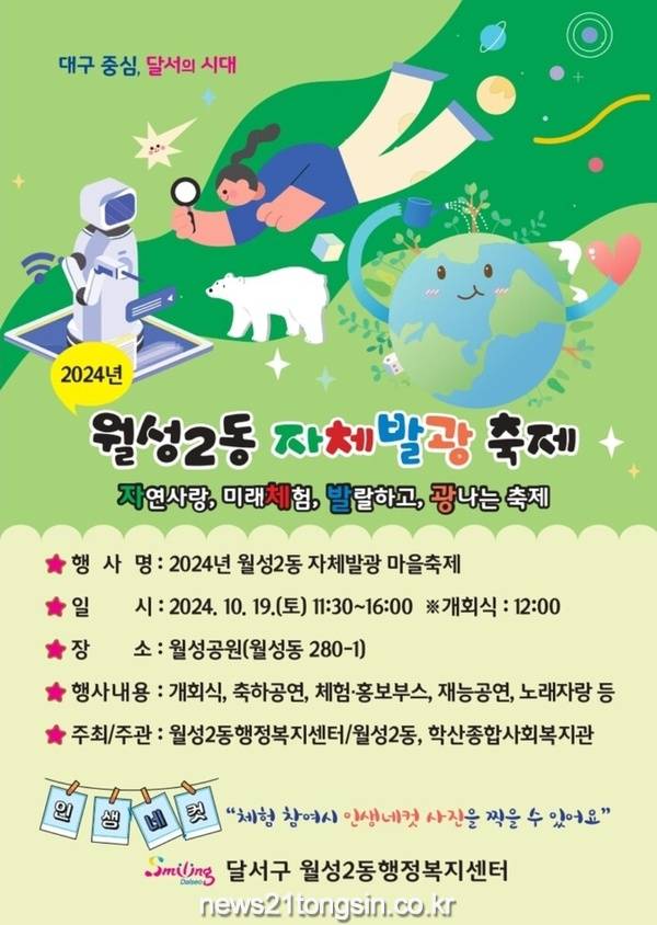 (뉴스21통신) 최우성기자 = 대구 달서구(구청장 이태훈)는 오는 19일 월성공원에서 탄소중립과 미래체험을 주제로 하는 월성2동 자체발광(자연사랑, 미래체험, 발랄하고, 광나는) 마을축제를 개최한다.