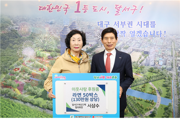 (뉴스21통신) 최우성기자 = 대구 달서구(구청장 이태훈)가 15일 서삼수 회장(달서구 여성단체협의회)으로부터 관내 취약계층에게 지원해 달라며 라면 50박스(130만원 상당)를 기탁받았다고 밝혔다.