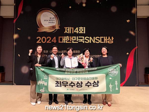 (뉴스21통신) 최우성기자 = 대구광역시와 (재)대구문화예술진흥원(원장 ‘박순태’, 이하 ‘문예진흥원’) 관광본부는 지난 17일(목), ‘(사)한국소셜콘텐츠진흥협회’가 주최하고 ‘과학기술정보통신부’가 후원하는 ‘제14회 2024 대한민국 SNS 대상’에서 관광부문 최우수상을 수상했다.