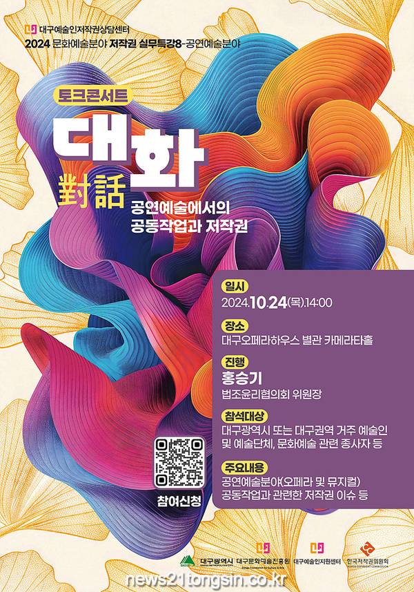 (뉴스21통신) 최우성기자 = 대구문화예술진흥원(원장 박순태, 이하 ‘문예진흥원’) 대구예술인지원센터(이하 ‘센터’)는 한국저작권위원회(위원장 강석원, 이하 ‘위원회’)와 함께 대구지역 예술인 및 공연예술분야 종사자를 대상으로 한 저작권 토크콘서트 ‘대화(對話):공연예술에서의 공동작업과 저작권’을 오는 10월 24일(목) 오후 2시, 대구오페라하우스 별관 카메라타홀에서 개최한다.