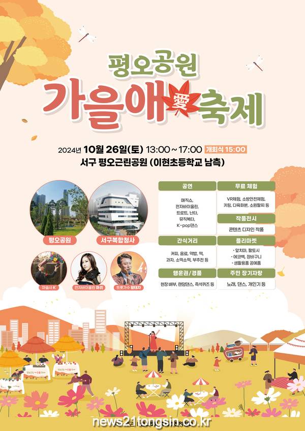 (뉴스21통신) 최우성기자 = 대구 서구 평리5동 「평오공원 가을애(愛) 축제」가 오는 26일 평오근린공원에서 개최된다.