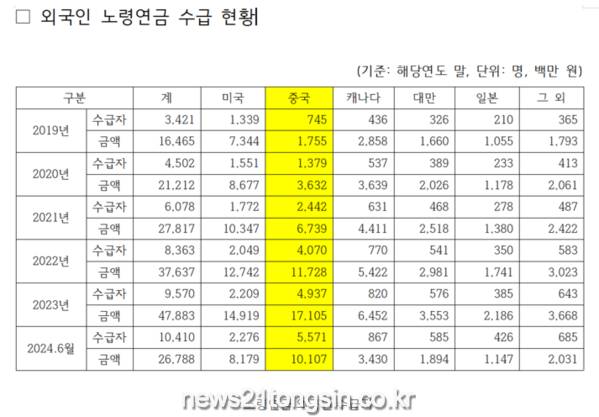 ▲ 자료=전자신문 캡쳐베트남인과 캄보디아인의 경우, 각각 2022년과 지난해 사업장 가입 대상 국가로 지정되면서 국민연금 가입 인원이 매해 큰 폭으로 늘어나고 있다. 베트남인의 경우 지난해 연말 4만3541명에서 반 년 사이에 5000명 이상 폭증했으며, 캄보디아인도 지난해 연말 2만7821명에서 반 년 동안 3000명 가까이 늘어났다.