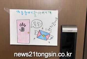 현관문 앞에 종이 한 장이 붙어 있다. '18층 할머니 할아버지께, 똑똑 편지 왔어요'라는 문구와 그림이 그려져 있는데.