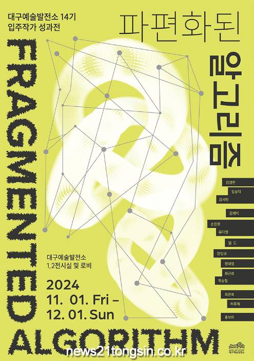 뉴스21통산) 최우성가자 = (재)대구문화예술진흥원(원장 ‘박순태’)이 운영하는 대구예술발전소는 입주작가들이 연간 구축해 온 작업 성과물을 공개하는 입주작가 성과전 ‘파편화된 알고리즘’展을 오는 11월 1일(금)부터 12월 1일(일)까지 대구예술발전소 1, 2전시실 및 로비, 윈도우 갤러리에서 개최한다.