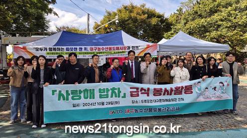 (뉴스21통신) 최우성기자 = 대구농수산물유통관리공사(사장 김상덕)와 도매시장 농산법인은 10월 29일(화) 어려운 이웃을 돕기 위해 농산물 기부와 봉사활동을 실시했다.