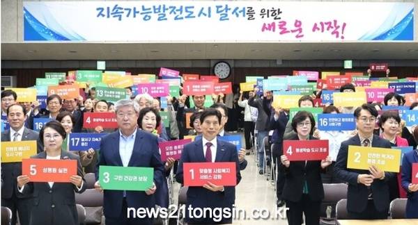 (뉴스21통신) 최우성기자 = 대구 달서구(구청장 이태훈)가 23일 구청 대강당에서 지속가능발전 선도도시 달서 조성을 위한‘지속가능발전 비전 선포 및 실천 다짐대회’를 개최했다.