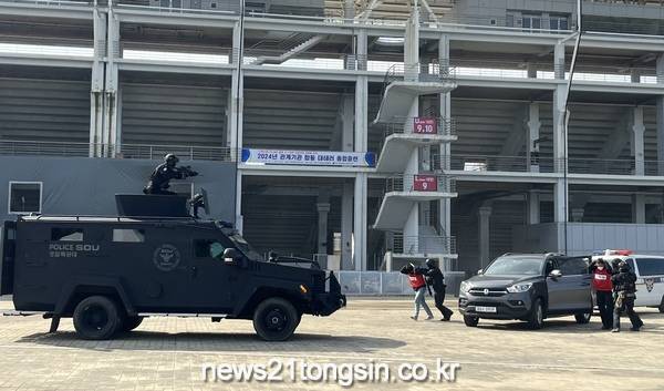 [뉴스21통신 박민창기자] 전남경찰청이 영암 국제자동차경주장에서 국가정보원(광주지부), 육군 31사단, 공군 1전투비행단, 영산강유역환경청, 전남소방본부 등 11개 기관 183여 명이 참여한 가운데 관계기관 합동 대테러 종합훈련을 실시했다.