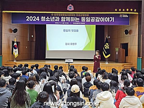 민주평화통일자문회의 의성군협의회(회장 박지혁)는 지난 1일 의성초등학교 튼튼관에서 의성초등학교 4~6학년에 재학중인 학생과 교직원 등 260여명을 대상으로 ‘청소년과 함께하는 통일공감 이야기’ 강연회를 개최했다고 밝혔다.