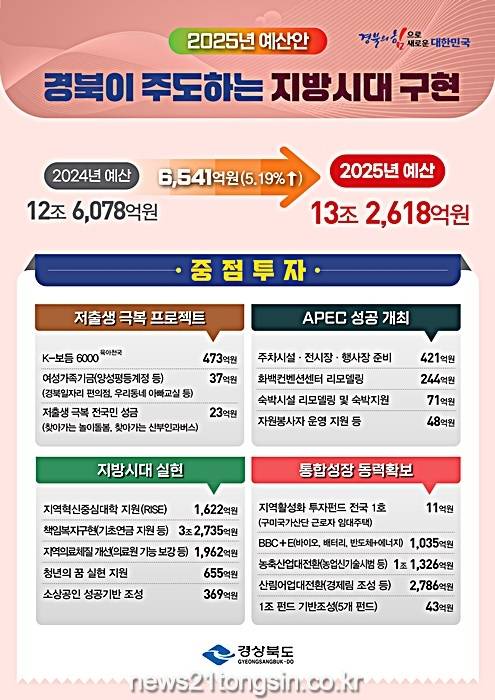 저출생 극복 프로젝트, APEC 성공 개최를 통한 경북 위상 강화, 1조 펀드 조성 등을 통한 민간투자 활성화, 경북이 주도하는 지방시대 실현, BBC+E(배터리, 바이오, 반도체+에너지) 등 미래성장동력 확충 등 핵심과제에 집중적으로 투자해 경북이 다시 한번 대한민국 성장의 중심이 될 수 있는 마중물 예산안을 편성했다.