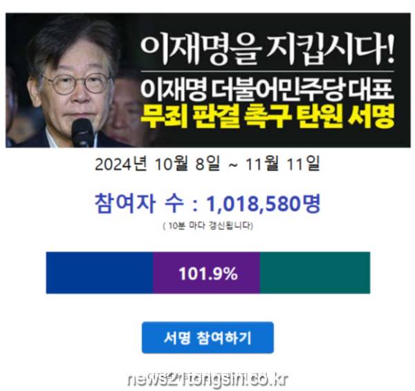 공직선거법 위반 1심 선고를 앞두고 있는 이재명 더불어민주당 대표의 무죄 판결을 촉구하는 탄원 서명이 100만을 넘어섰다.11일 오전 9시 더민주전국혁신회의가 운영하는 이재명무죄탄원 홈페이지에는 이재명 대표 무죄 판결 촉구 탄원 서명 참여자 수가 100만1만567명인 것으로 집계됐다. 탄원 서명은 지난달 8일부터 시작돼 한 달 여 만에 100만여명을 돌파한 것이다.앞서 이 대표는 대선 후보던 지난 2021년 12월 대장동 개발 비리 의혹과 선을 긋기 위해 사업 핵심 실무자인 고 김문기 씨를 성남시장 재직 때 몰랐다고 말해 허위 답변을 한 혐의로 재판에 넘겨졌다.이에 검찰은 2022년 9월 이 대표를 공직선거법 위반(허위사실유포) 혐의로 불구속 기소했다.