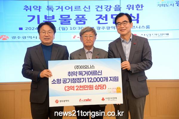 광주광역시는 11일 시청 비즈니스룸에서 ㈜이오니스가 광주지역 홀로 사는 어르신들을 위해 소형 공기청정기 기부물품을 전달했다고 밝혔다.