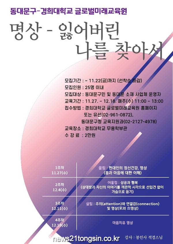 ‘명상-잃어버린 나를 찾아서’ 강좌는 이론과 실습을 병행해 자신과 타인에 대한 이해를 높이고 마음 치유를 도모하는 프로그램으로, 총 4회차로 진행된다. 강의는 ▲현대인의 정신건강과 명상(울림) ▲성공과 행복(어울림) ▲주의와 연결감을 높이는 빛 명상(살림) ▲마음 치유 명상으로 구성된다. 해당 강의는 11월 27일부터 12월 18일까지 매주 수요일 오전 11시부터 오후 1시까지 경희대학교 무용학부관에서 열린다.