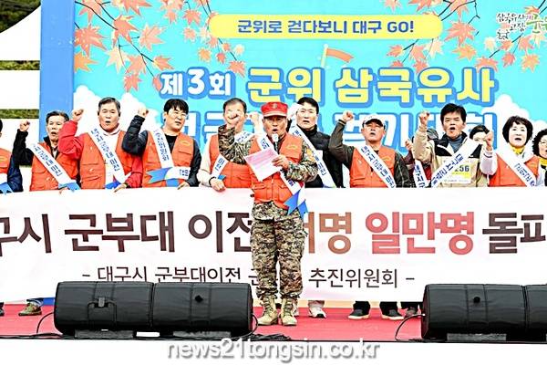 대구 군부대 이전 군위군 추진위원회(이하 “추진위원회”)는 지난 9일 군위삼국유사면민운동장에서 열린 군위 삼국유사 전국가족걷기대회 행사에서 대구시 군부대 군위군 이전 대군민 2만명 서명 운동을 펼쳤다.