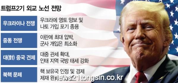 ‘힘을 통한 평화’는 트럼프가 조 바이든 행정부를 비판하고 자신의 외교 성과를 내세우며 강조했던 대표적인 수사다. 트럼프의 외교·안보 참모인 로버트 오브라이언 전 국가안보보좌관은 “미국의 적들은 지난 4년 동안 그들이 저지른 일들이 더 이상 용납되지 않을 것임을 알고 있다”고 자신했다. 반전(反戰) 성향이 있는 트럼프가 전쟁에 직접 개입하지는 않겠지만 우크라이나와 중동 등지에서 자신의 중재 능력을 보이고 이를 과시하려 할 가능성은 매우 높다.트럼프는 이달 7일 블라디미르 푸틴 러시아 대통령과 통화한 자리에서 유럽에 주둔한 미군의 존재를 언급하며 우크라이나 전쟁을 더 이상 확대하지 말라고 말했다고 워싱턴포스트(WP)가 보도했다. 전문가들은 트럼프가 취임 직후 종전에 적극 개입하겠다는 신호라는 해석을 내놓았다. 트럼프 측근들 사이에서는 우크라이나의 북대서양조약기구(NATO·나토) 가입을 최소 20년간 유예하고 현재 전선을 유지한 채 비무장지대를 조성하는 방안 등이 종전 구상으로 거론된다. 이 과정에서 트럼프는 우크라이나에 영토 양보를 압박할 수 있는데 이는 국제 질서를 바탕으로 했던 바이든 정부의 외교 노선과 차별화되는 지점이다. 다만 러시아는 트럼프 당선인과 푸틴 대통령이 전화 통화를 했다는 보도가 사실이 아니라며 공식적으로 부인했다. 드미트리 페스코프 크렘린궁 대변인은 11일 브리핑에서 “완전히 사실이 아니다. 순전히 허구다. 전적으로 잘못된 정보일 뿐”이라고 강하게 부인했다.동맹을 향한 대외 정책에서도 트럼프는 바이든의 ‘리더십 복원’보다는 미국의 이익을 최우선 순위에 놓고 있다. 트럼프 2기 국무장관 후보로 유력하게 점쳐지는 빌 해거티 연방 상원의원(공화·테네시)은 10일 CBS와의 인터뷰에서 “우리는 동맹국들이 가능한 한 범위 내에서 자신들의 군사 역량을 강화해야 한다는 메시지를 전달해야 한다고 생각한다”면서 한국 등의 국방비 인상이 필요하다고 주장했다. 트럼프는 선거운동 기간 나토를 향해 “방위비를 내지 않으면 러시아로부터 보호하지 않을 것”이라고 위협했고 한국을 향해서는 ‘머니 머신’이라 부르기도 했다. 또 세계 최대 파운드리(반도체 위탁 생산) 업체인 대만 TSMC가 설립하는 미국 애리조나 공장의 완공식에 트럼프 당선인이 직접 참석할 가능성도 점쳐진다.트럼프의 이 같은 행보와 관련해 핵심 안보 이익에 충실하다는 분석이 나온다. 앤드루 레이섬 평화외교연구소 선임연구원은 “트럼프의 접근 방식은 전통과는 거리가 멀지만 무모하거나 고립주의적이지도 않다”면서 “미국의 핵심 안보 이익이 걸린 것에 최대한 집중하겠다는 것”이라고 평가했다.다만 북한·중국·러시아·이란 등이 군사·경제적으로 밀착하는 복잡한 안보 환경 속에서 트럼프식 외교는 여전히 불안정하다는 지적도 적지 않다. 민주당의 크리스 쿤스 상원의원은 미·유럽 관계가 틀어질 경우 중국에 지정학적 이익이 될 수 있다며 “중국은 이러한 균열을 기다리며 오랫동안 준비해왔다”고 우려했다. CNN은 북러 밀착과 남한의 대북 강경 노선 등을 지목하며 “트럼프가 김정은과의 친분을 과시하고 있으나 그는 대담하고 더 위험해진 북한 지도자와 마주하게 될 것”이라고 전했다.