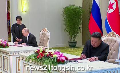 푸틴 러시아 대통령이 서명한 지 이틀 만에, 김정은 위원장도 북러 간 체결된 '포괄적인 전략적 동반자 관계 조약'에 서명했다.