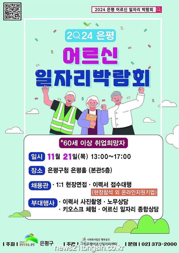 은평구(구청장 김미경)는 오는 21일 오후 1시부터 5시까지 은평구청 5층 은평홀에서 ‘2024년 은평어르신일자리 박람회’를 개최한다고 밝혔다.