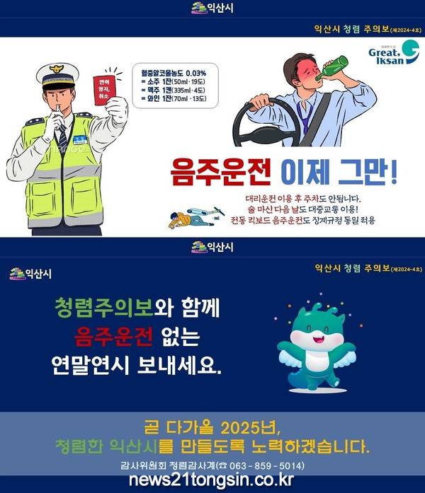 익산시가 연말연시를 앞두고 25일 음주운전 징계 규정을 알리는 4차 청렴주의보를 발령했다.