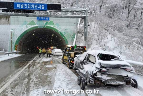 당시 눈길에 미끄러진 제네시스 승용차를 뒤따르던 화물차가 들이받았고, 이어 뒤따라오던 코란도와 아반떼, 산타페 승용차가 잇따라 추돌했다.