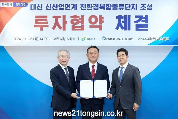여주시는 지난 11월 26일 시청 시장실에서 이충우 여주시장, 남선우 ESR켄달스퀘어 대표, 김찬수 대신로지스파크 대표와 함께 친환경복합물류단지 조성을 위한 투자협약(MOU)을 체결하고 2조원의 투자유치를 확정했다.