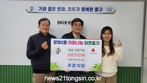 대전 중구 문화2동(동장 임청희)은 28일 대전 푸른의원(원장 박진석)에서 관내 취약계층을 위하여 성금 1,200만 원을 기탁했다고 밝혔다.