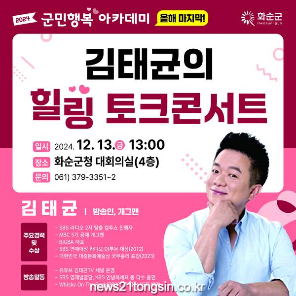 화순군(군수 구복규)은 오는 13일 오후 1시부터 화순군청 4층 대회의실에서 개그맨이자 방송인인 김태균 씨를 강사로 초청하여 '2024 군민행복 아카데미 9회차 강연을 개최한다고 밝혔다.