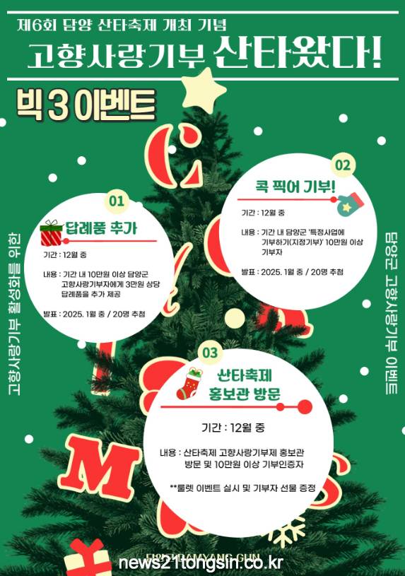 담양군(군수 이병노)이 이달 24일부터 이틀간 진행되는 제6회 산타축제를 기념해 고향사랑기부제 ‘빅(big)3’ 이벤트를 실시한다.