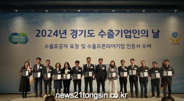경기도는 10일 오후 라마다 프라자 수원 호텔에서 ‘2024년 경기도 수출기업인의 날’ 행사를 열고 수출증대로 지역사회 발전에 기여한 수출기업과 유관기관 임직원에게 표창을 수여하고 수출프론티어기업 인증서를 전달했다.