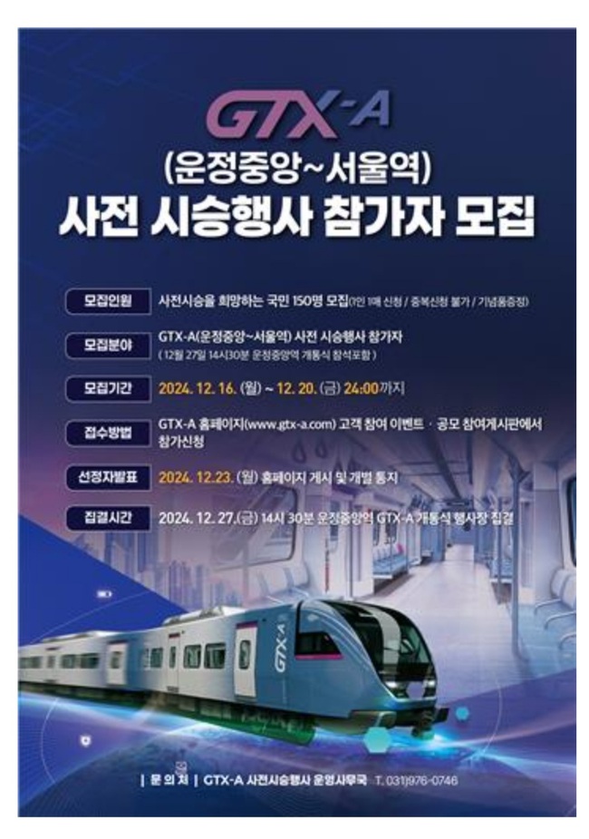 개통식 및 사전 시승식 행사 참가 희망자는 누구나 GTX-A 누리집(gtx-a.com)을 통해 16∼20일 신청하면 된다. 총 150명을 무작위 추첨 방식으로 선발해 23일 개별 통지한다.