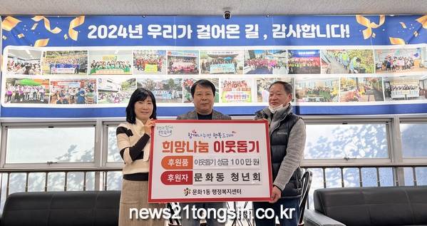 대전 중구 문화1동(동장 장성임)은 18일 문화동청년회(회장 김용인)에서 이웃돕기 성금 100만 원을 기탁했다고 밝혔다.