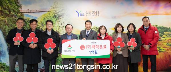 연천군 소재 생수 브랜드 ‘아이시스’ 제조 유통회사 ㈜백학음료(대표 정용주)는 16일 연천군청 2층 군수실에서 경기사랑의열매(회장 권인욱) 경기북부사업본부에 성금 1억 원을 기부하며 나눔명문기업으로 가입했다고 밝혔다.